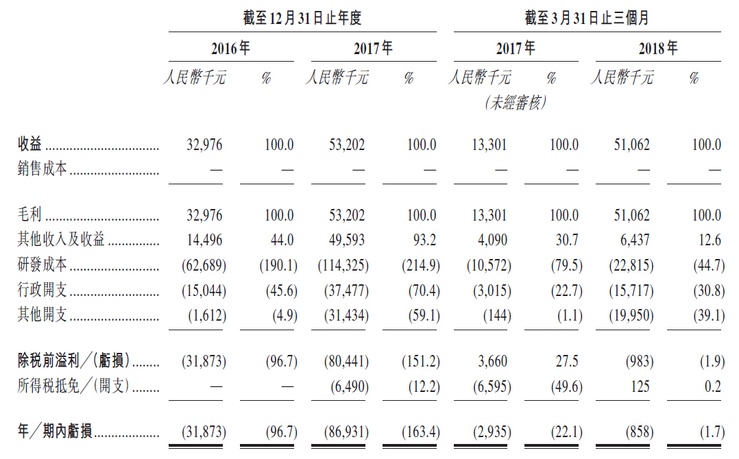 公司收益来源是来自罗氏就戈诺卫(达诺瑞韦)许可安排作出的分期前期付款,当期分别确认收益为人民币3300万元及5320万元。此外公司其他收益包括政府补助、银行利息和金融资产利息收入。其中2017年银行利息和金融资产利息收入分别为1000万和700万人民币,证明公司目前现金流充裕,在满足研发成本和其他开支之外,还可以利用部分闲置现金获得收入。