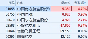 智通财经APP获悉,人民币中间价今日大幅下调,受此影响,航空板块走强。截至13时51分,中国南方航空股份(01055)涨4.7%,中国国航(00753)涨3.9%,中国东方航空控股(00670)涨2.71%。