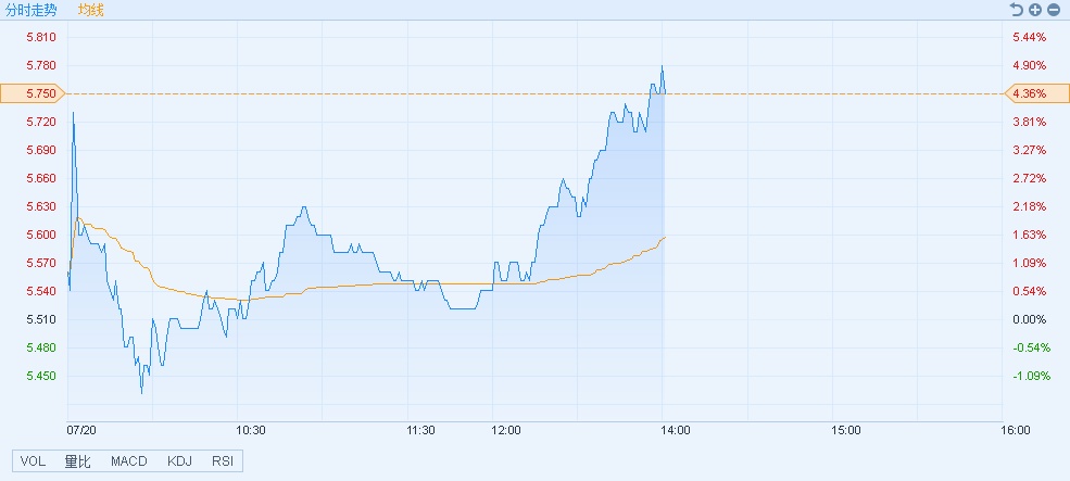 智通财经APP获悉,中国东方集团(00581)午后放量上涨,截至14时00分,涨4.36%,报价5.75港元,成交额6346.06万。