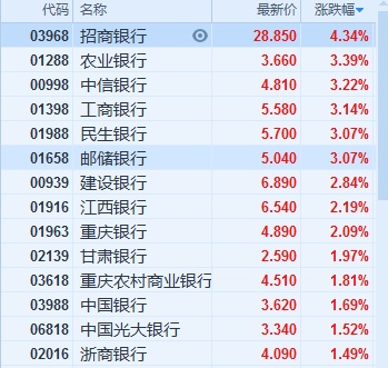 智通财经APP获悉,今日午后银行板块强势反弹,截至14时07分,招商银行(03968)涨4.34%,农业银行(01288)涨3.39%,工商银行(01398)涨3.14%,建设银行(00939)涨2.84%。