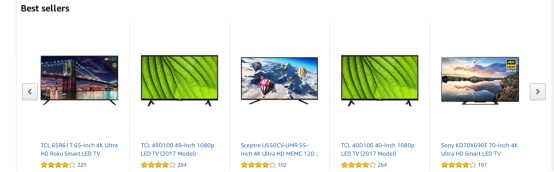 智通财经APP在亚马逊北美官网上查询到,在北美亚马逊最畅销电视榜单中,TCL电子旗下多款电视机均名列前茅,不同尺寸的电视机纷纷获得了消费者四星以上的好评。