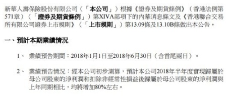 新华保险半年预增百分80,比我个人的预期好一些,我年初的预期是增百分50左右。这个每股盈利增长,主要是准备金从计提到释放,是去年年底就可以预测到的。但特别注意一点,保险公司的准备金的释放,会持续到19年。但这,也是去年基本就可以预测的。