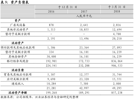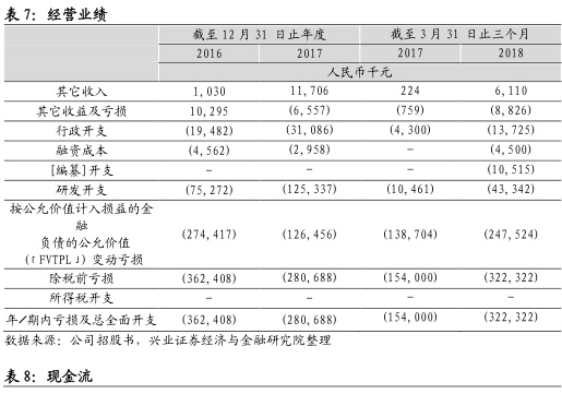 公司合计亏损近10亿,现金流较为充足。华领医药尚未有产品实现商业化,迄今未通过销售商品产生收益,仅以政府补贴及银行利息确认有限收入,分别在2016年、2017年和2018年3月31日截止前确认60万元,1050万元和580万人民币的政府补助。2016年-2018年Q1分别亏损3.6亿、2.8亿和3.22亿,累计亏损近10亿,主要由于研发开支和按公允价值计入损益的金融负债的公允价值变动亏损造成的。截止2018年3月31日,公司拥有8.36亿银行结余与现金。