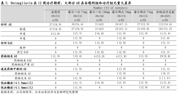 (2)安全性高于以往GKA药物。以往GKA药物由于化学结构相关的缺陷引致疗效不足、低血糖风险增加、血脂异常及肝脏中毒等多种问题而未能完成临床II试验。Dorzagliatin由于采用独特的化学结构并通过双重作用机制在I期及II期临床试验展现了良好的耐受性和低副作用,成为首个成功进入临床III期GKA药品。
