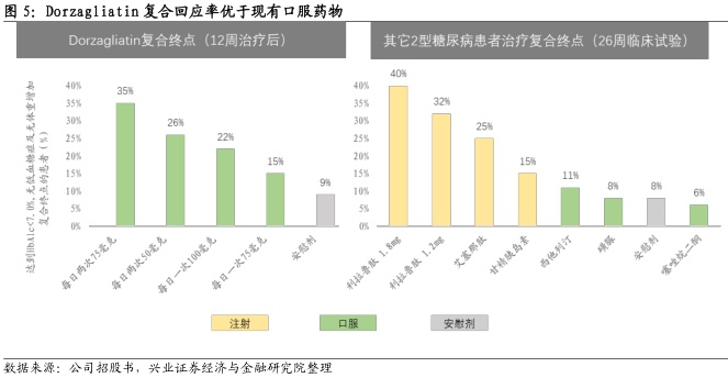 Dorzagliatin具有两大优势:(1)疗效优于现有的口服药。目前批淮的2型糖尿病药物侧重降低血糖水平,但未能阻止负责制造胰岛素的β细胞功能恶化的问题,从而无法维持葡萄糖稳态平衡。GK在葡萄糖稳态中发挥的作用在二十多年前被揭示,是糖尿病理想的治疗途径。Dorzagliatin在临床II期12周试验中,35.4%的患者达到了复合终点,包括HbA1c水平血糖控制至7%以下,且未出现体重增加及低血糖情况。之前表现最佳的口服药是sitagliptin(口服DPP-4抑制剂及全球最畅销的口服抗糖尿病药),仅11%患者使用后到达该等复合终点。