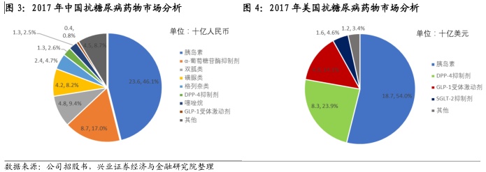 传统药物占据市场主导,创新药物渗透率待提升。中国市场的抗糖尿病药以传统药物为主,而DPP-4、GLP-1及SGLT-2抑制剂等创新药物的销售收入较少。除了胰岛素外,α-葡萄糖甘酶抑制剂及双胍类二甲双胍亦因其价格相宜、降糖效果显着、具有降低心血管疾病风险等其他临床效益而在中国占有重大市场份额。美国则以DPP-4、GLP-1及SGLT-2抑制剂等创新药物为主要药物。