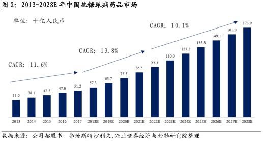 受益多重利好因素,2型糖尿病药物市场前景广阔。据弗若斯特沙利文数据,2017年全球约有4.53亿人患有糖尿病,其中4.35亿为2型糖尿病患者,中国是2型糖尿病患者最多的国家,2017年有1.2亿患者。2017年全球抗糖尿病药物市场为689亿美元,预计2022年增加至907亿美元,复合增长率5.6%。随着患者人口增加,慢性病利好政策出台以及创新药物出现,2型糖尿病药物市场呈现利好趋势。中国抗糖尿病药物市场预计将从2017年的人民币512亿元增加到2022年的人民币978亿元,复合年增长率为13.8%。