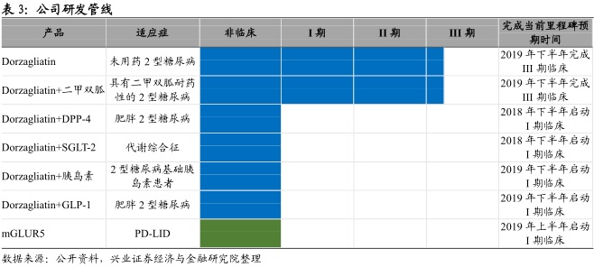 品公司目前有两款在研产品Dorzagliatin与与mGLUR5。Dorzagliatin是一种葡萄糖激酶激活剂(GKA),旨在通过恢复2型糖尿病患者的葡萄糖稳态平衡来控制糖尿病的渐进性退行性特性。Dorzagliatin作为单药疗法和与二甲双胍联用的疗法目前进行到III期临床。研发管线还包括Dorzagliatin与其它获批的2型糖尿病治疗的的联合疗法,计划在2018和2019年开展临床试验。