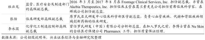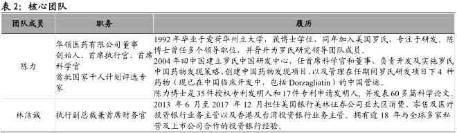 核心团队经验丰富,高管均具有大型药企工作背景。公司创始人陈力博士亦为公司首席执行官、首席科学官,是首批国家“千人计划”评选专家之一,在生物制药行业拥有逾20年经验。加入华领前,陈博士是中国上海的罗氏中国研发中心的创办董事兼首席科学官,一直积极参与Dorzagliatin(现为第四代)的开发工作。加入华领后,陈力博士组建了具有丰富药品研发、管理和运营经验的团队,核心研发团队成员均具有在罗氏、葛兰素史克、辉瑞等跨国药企的工作经验。此外,FranzMatschinsky博士(在发现GK于葡萄糖稳态平衡的中心角色中起作用)担任公司的高级顾问。