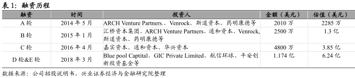 全球知名创投持续看好,5年融资超2亿美金。公司获多家全球知名创投持续看好,总计获得约2亿美金投资。2018年3月27日完成1.174亿美元的D轮和E轮融资。公司股权结构分散,持股比例最高为专注投资早期生命科技公司的ARCHVenturePartners,美国著名风投基金Venrock,富达集团下属斯道资本以及F-Prime基金,分别持有15.07%,12.46%,6.74%、6.23%的股份。此外,药明康德创始人李革夫妇以及李革持30%的WuxiHealthcareVentures分别持有3.37%和8.92%。公司创始人陈力博士家族持有4.95%。