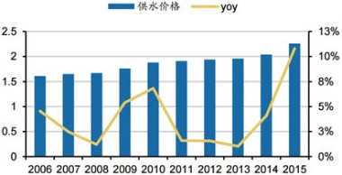 水务行业是关系国计民生的公共事业,政府对行业运行加以较为严格的监督和管理,集中体现在供排水价格的定价机制上,但近年来供水价格一直呈上涨趋势,并有进一步提升的空间。智通财经APP了解到,全国平均水价自2011年至2015年,从1.91元/立方米上涨至2.26元/立方米,年均复合增速为4.3%,并在近年有加速上涨的势头。