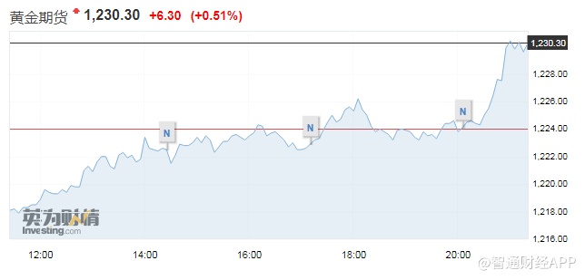 黄金拉升6.3点,升幅0.51%,报1230.3。