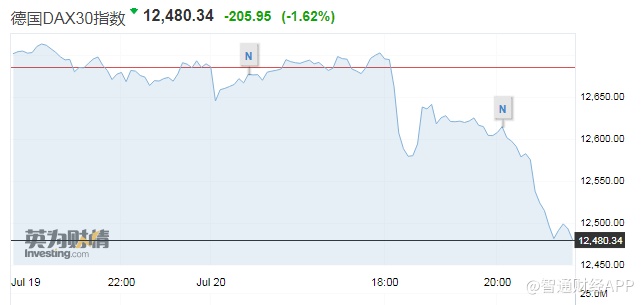 同时,欧股遭遇暴跌,德国DAX30指数跌1.62%,截至发稿,报12480.34。法国CAC40指数跌1.24%,报5349.84。