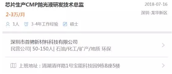 国内还有其他公司在推进抛光液研发,比如这个某招聘网站上的信息,深圳首骋新材料公司于2018年7月16日发布招聘芯片生产CMP抛光液研发技术总监,月薪2-3万元。该公司的核心团队成员来自美国硅谷。公司创始人李德林博士入选国家“千人计划”。公司从事太阳能电池导电银浆和电子导电银浆的研发生产和销售。