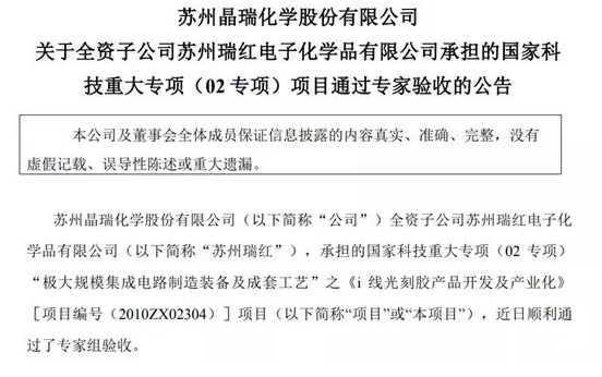 2018年6月16日,晶瑞股份公司发布公告,该公司旗下全资子公司苏州瑞红承担的国家科技重大专项(02 专项) “极大规模集成电路制造装备及成套工艺”之《i 线光刻胶产品开发及产业化》,近日顺利通过了专家组验收。