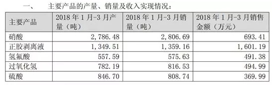 2018年一季度,该公司硝酸,正胶剥离液,氢氟酸,过氧化氢,硫酸五种产品的销售额达到3651万元,处于快速增长的态势。