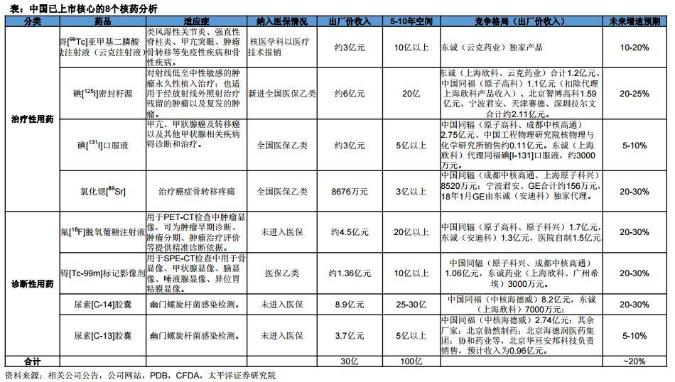 据太平洋证券的研报分析指出,核药的净利率40%到50%也不为过。诊断性核药保证核药5年较快增长,治疗性核药保证核药中长期较快增长并打开成长天花板。 2017年核心的8个核药产品出厂价收入30亿元,其中:东诚药业约7亿,中国同福约20亿,若不考虑中国同福11亿收入的尿素14C和尿素13C胶囊,双方规模相当。