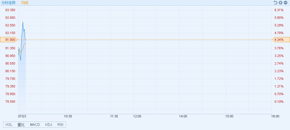 智通财经APP获悉,药明生物(02269)上半年净利预增超2.5倍,早盘高开。截至9时39分,涨4.27%,报价81.75港元,成交额1.25亿。