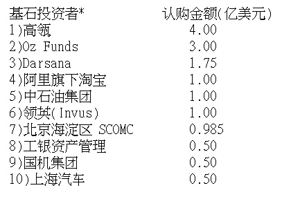 该公司本次引入10名基石投资者,共涉资14.235亿美元(约111亿港元),相当于集资未计行使超额配股权的16.3-20.4%,详细如下: