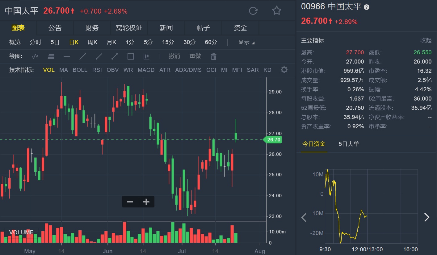 截至7月23日12:00,中国太平涨2.69%,报26.7港元。