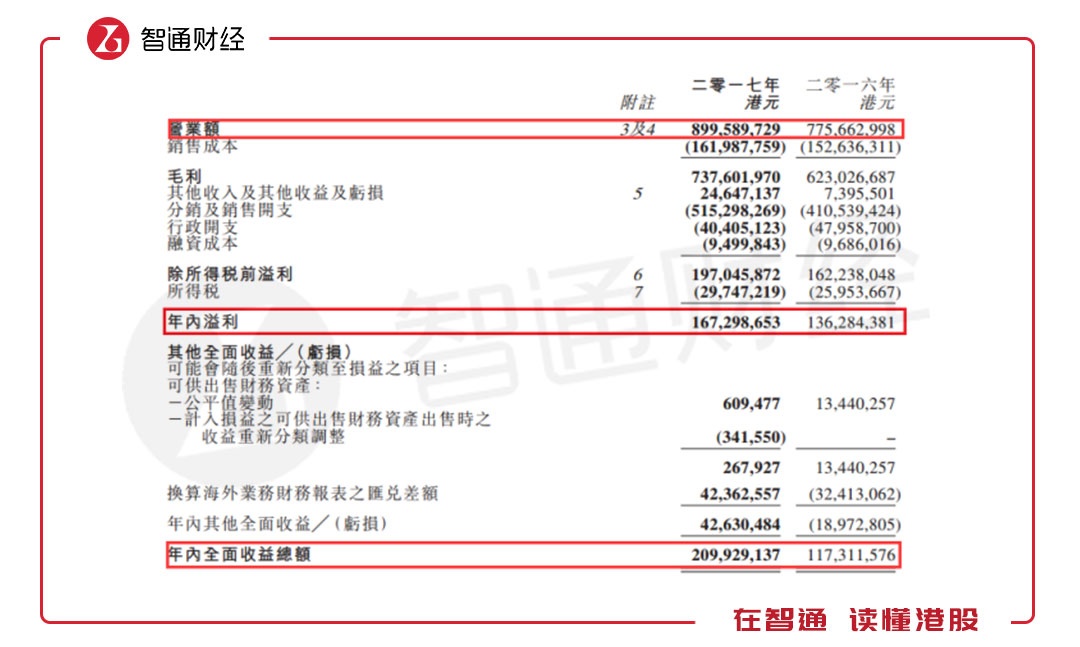 •先说榜首的亿胜生物。2017年,该公司期内营业额为8.996亿港元,同比增长16%。毛利为7.376亿港元,同比增长18.4%。年内溢利为1.67亿港元,同比增长22.8%。