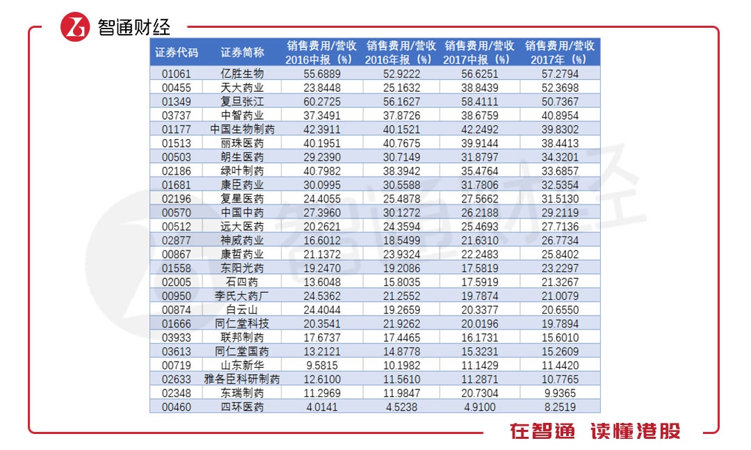 事实上,和A股疫苗公司一样,港股虽无真正做疫苗的企业,但也冒出不少销售费用偏高的药企。智通财经APP根据2017年财务数据对比发现,港股医药板块销售费用占总营收比例最高的五位,分别为亿胜生物(01061)、天大药业(00455)、复旦张江(01349)、中智药业(03737)以及中国生物制药(01177)。但放眼一看,除中国生物制药外,其余都是中小市值,甚至“壳”票。
