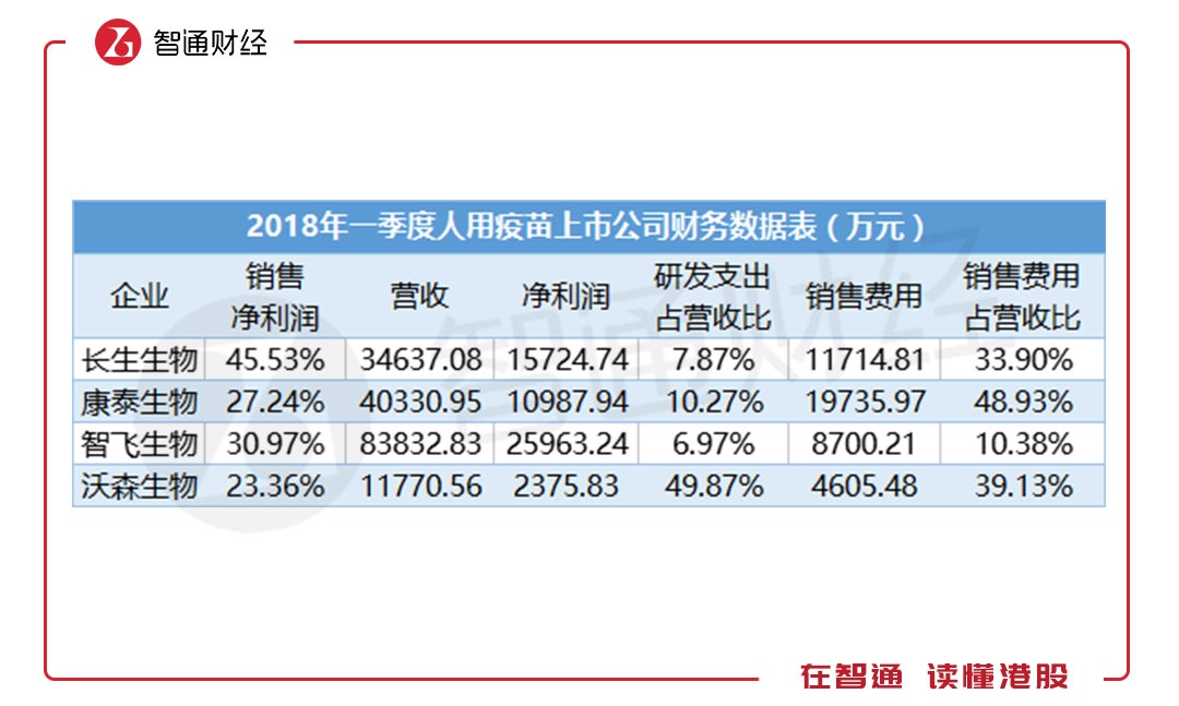 数据显示,A股几家人用疫苗上市企业2018年一季度平均净利润率为31.77%,同期医药行业上市公司平均净利润率仅为15.37%,A股上市公司平均净利润率为14.31%。其中,长春生物位居榜首,一季度净利润率超过45%。