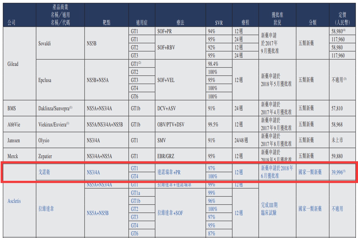 6、根据招股书披露:公司研发的达诺瑞韦(戈诺卫®)是一种较高的治愈率(97%)、更短的疗程(12周)及优异的安全及耐受性表现的方案,已经通过国家监管部门商业化审批。而目前中国主要的疗法实现的治愈率约为60% (SVR24),疗程为48至72周。招股书同时披露:歌礼制药研发的戈诺卫一个疗程需要费用3.99万元,而目前国家食品药品监管总局批准的其他直接抗病毒药物价格基本在5.8万及以上,看起来优势明显。