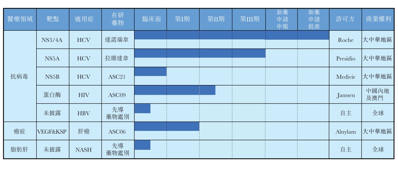 公司目前有五项抗病毒药物发现和开发计划,包括两个处于或临近商业化阶段的丙肝在研药物和一个已完成IIa期临床试验的HIV在研药物。此外,公司有一个已完成 I期及I期扩展临床试验的肝癌在研药物。
