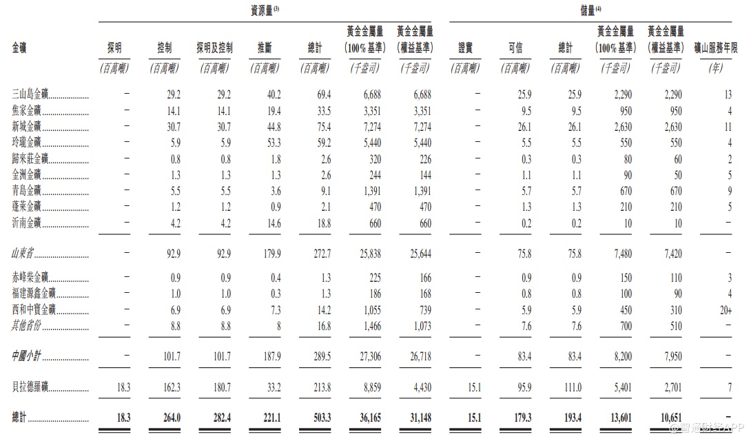 截至2018年3月31日,该公司控制及经营12座中国矿山,据AAI报告,山东黄金矿业应占中国矿山的储量及资源量分别为7950千盎司及26718千盎司。其中,该公司四大主要矿山的矿山服务年限介于4到13年之间。此外,山东黄金矿业还与巴理克黄金按50-50%基准共同经营贝拉德罗矿。
