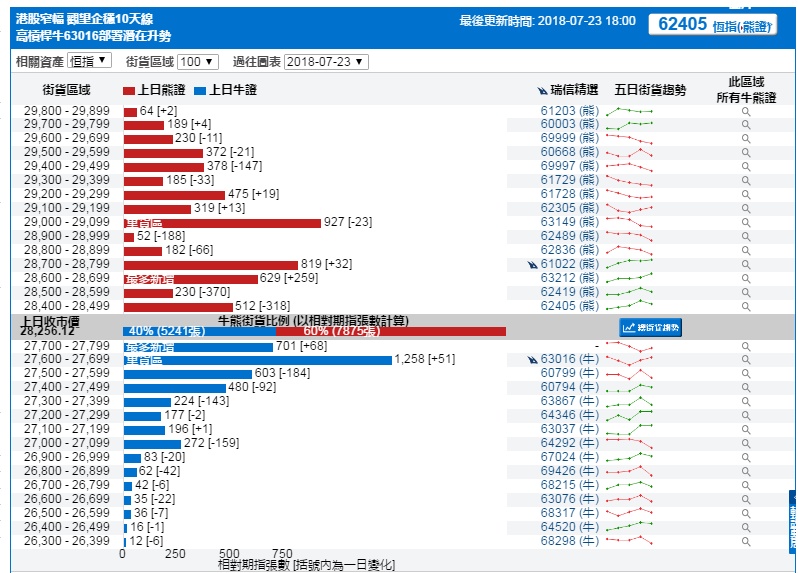 智通财经APP获悉,截至7月23日,恒指最新的牛熊街货比例为40:60。从瑞信恒指牛熊证街货分布图中得到的数据显示,熊证街货重货区在29000-29099区间,此区间最新的熊证数量为927张,比上一交易日减少23张,最多新增在28600-28699区间,此区间最新的熊证数量为629张,比上一交易日增加259张。牛证中重货区在27600 - 27699区间,该区间最新牛证数量为1258张,比上一交易日增加51张,最多新增在27700-27799区间,新增68张。
