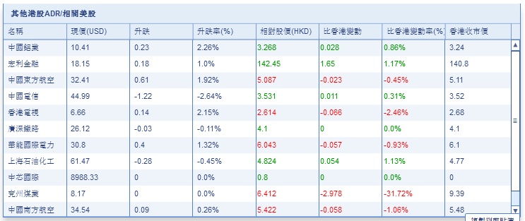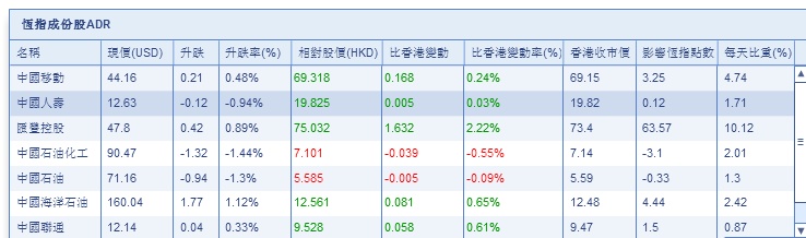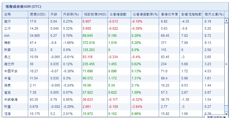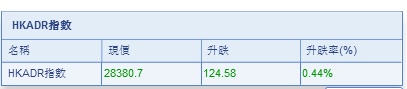 智通财经APP获悉,截至7月23日美股收盘,港股ADR指数全日上涨,按比例计算,收报28380.7点,升124.58点或0.44%。大型蓝筹个别发展,滙丰控股收报75.03元,较港收市升1.63元;腾讯控股收报372.02元,较港收市升1.02元。内银股、航空股、石油股下跌。