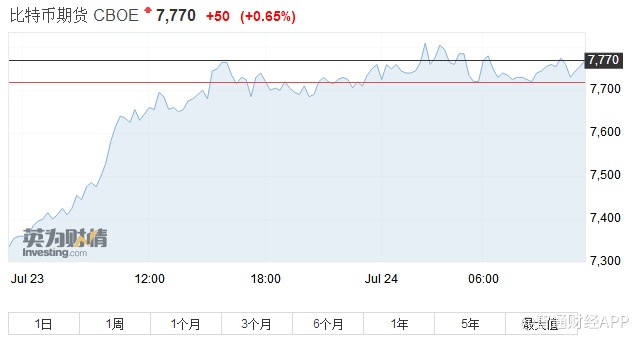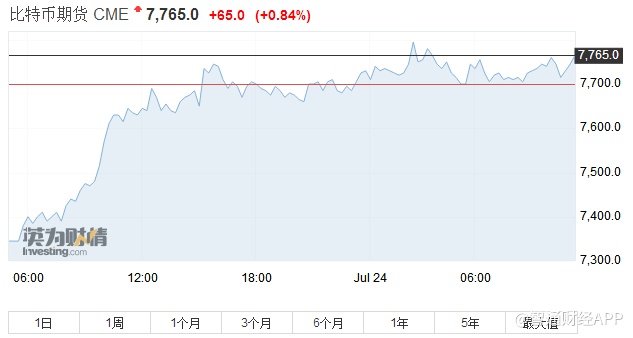 截至北京时间11:25,CBOE比特币期货涨0.64%或50美元,报7770美元;CME比特币期货涨0.84%或65美元,报7765美元;比特币涨1.8%或139.7美元,报7766.6美元,逼近8000美元关口。