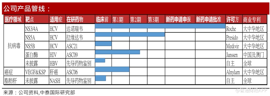 智通财经APP获悉,中泰国际发表研报称,歌礼制药(01672)是一个一体化的抗病毒平台,专注于抗HCV、HIV及HBV同类创新药物的开发及商业化。公司目前有七个产品管线,涉及抗病毒、癌症、脂肪肝三大领域。其中,抗病毒药物有五个,主要包括已商业化的戈诺卫®(达诺瑞韦)和即将商业化的拉维达韦。以及一个已完成IIa阶段临床试验的HIV在研药物,一个已完成第一阶段肝癌药物和临床前的脂肪肝药物。