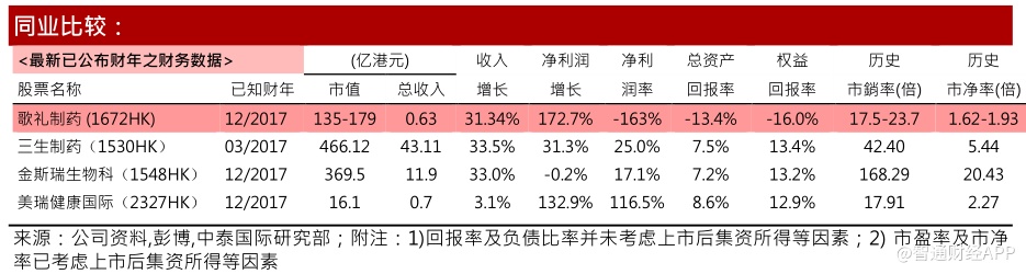 根据临床数据,歌礼的达诺瑞韦和拉维达韦的治愈率与原研药相近。在药效达标、价格相对便宜的条件下,中泰国际认为歌礼将以绝对的市场竞争力抢占中国市场先机。此外,公司预计新药上市后,将在2018年实现5亿元人民币的营收。参考其他丙肝药物企业如艾伯维(AbbVie)和吉利德(Gilead),2017年销售收益皆逾260亿美元,中泰国际看好歌礼的未来盈利,有望超过五亿目标。本次上市,歌礼保荐人阵容强大,为招商证券国际、高盛以及摩根士丹利担任联席保荐人。此外,歌礼亦引入新加坡政府投资公司(GIC)为基础投资者,认购7500万美元(约5.85亿港元)股份,占发售规模约16%。可以看出公司极具潜力,值得关注。