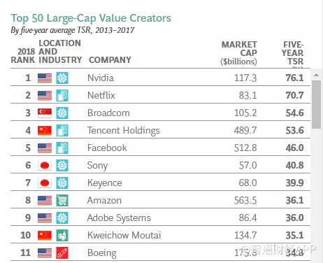 其中,2013-2017五年间平均股东回报率最高的四家企业分别为芯片制造商英伟达、奈飞、博通公司和腾讯控股,其中有三家均为科技公司。