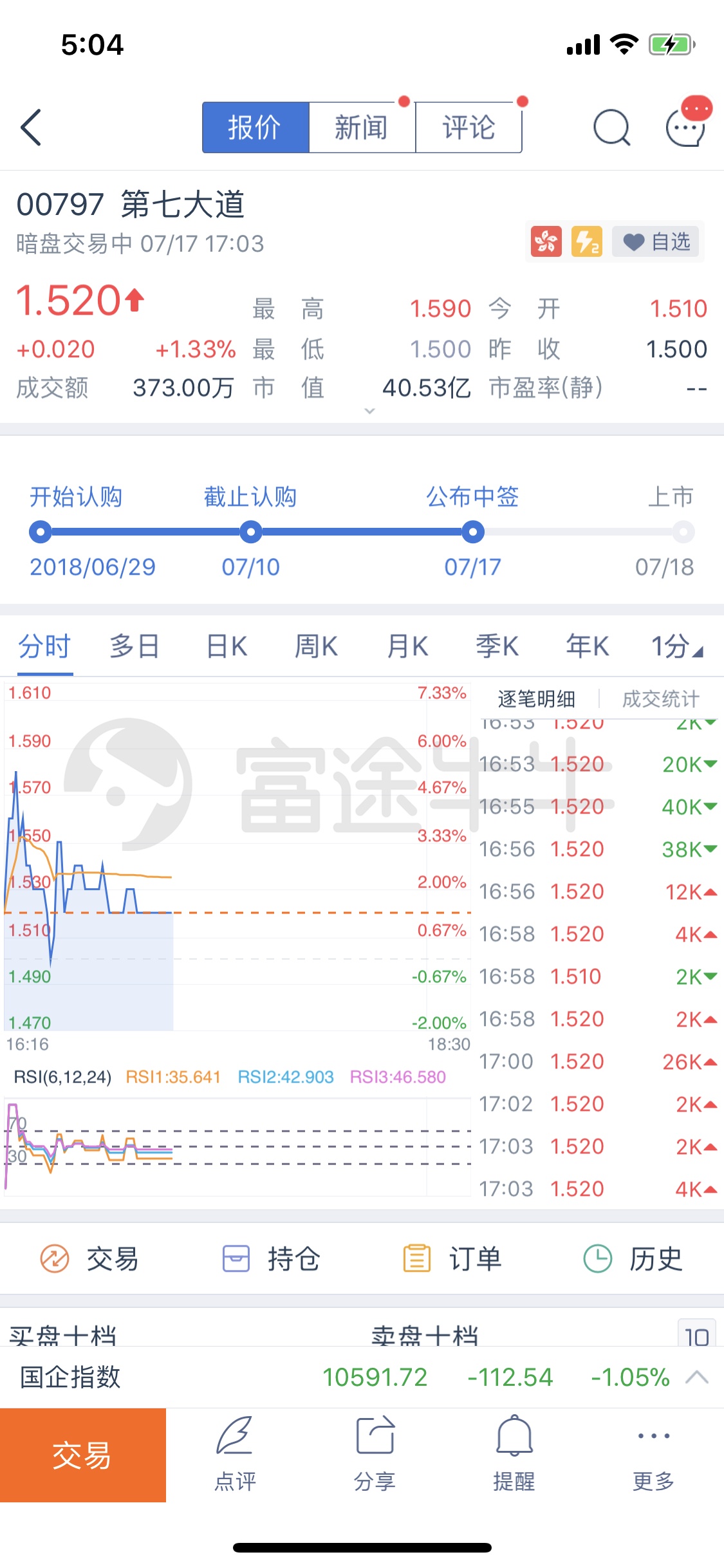 富途证券刚刚上限的暗盘交易功能内,投资者可通过富途牛牛一站式港股打新,完成新股认购,待中签结果公布后便可在规定交易时间内进行暗盘交易,最终还可挂牌上市后进行明盘交易。富途牛牛在暗盘中提供实时分时、日K、周K、逐笔成交、五档买卖盘、队列经纪人代号等丰富行情数据,并支持使用融资交易。费率上,富途证券暗盘佣金和正股一致,均为港股万三,最低三港元的业界极低佣金方案,投资者在功能、行情、费率等多维度上都能过足瘾。