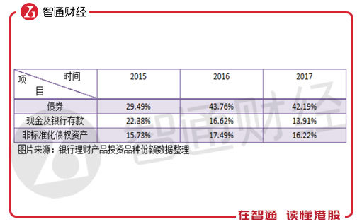 以前,除了信托资产,银行理财产品也是投资非标债权资产的主力之一,智通财经APP了解到,2017年银行理财产品余额29.54 万亿元,其中有16.22%的份额投资于非标债权,约为4.79万亿元,2015-2017年份额均较为平均。