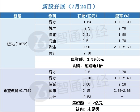 截至7月24日,正在招股的新股中,耀才、辉立、信诚、海通、敦沛5家券商为抗病毒创新药研发公司歌礼制药(01672)借出孖展金3.59亿港元,超额逾1倍认购;耀才、辉立、信诚、敦沛4家券商为全国第二大的民办高等教育集团希望教育(01765)借出孖展金3.2亿元,认购未足额。具体情况如下:
