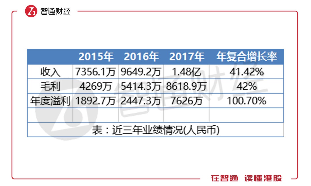 在优秀的技术及创新的业务模式下,维亚实现了业绩的快速增长。从2015-2017年,收入由7356万增长至1.48亿元人民币(下同),年复合增长率41%,毛利由4269万增至8618.9万,年复合增长率42%,年度溢利的增长率高至100%。