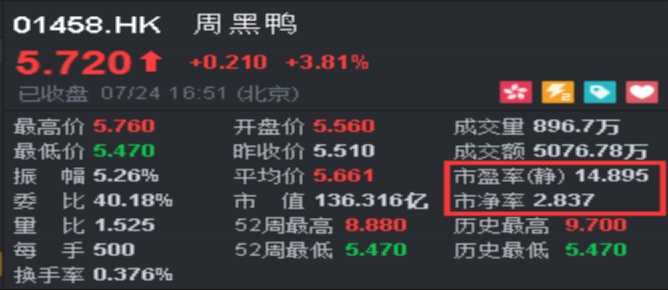 随着股价下跌,周黑鸭的估值水平已经来到14.9倍静态市盈率和2.84倍市净率,估值也已远低于两大竞争对手绝味食品(603517.SH)和煌上煌(002695.SZ)。