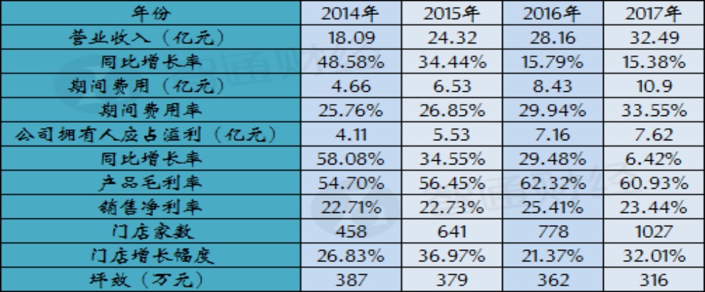 更值得注意的是,周黑鸭门店及费用的增长,并没有给公司盈利能力带来太多正向变动。公司坪效在2017年下降46万元至316万元,产品毛利率下将约1.4个百分点至60.93%,净利率下降近1个百分点至23.44%。