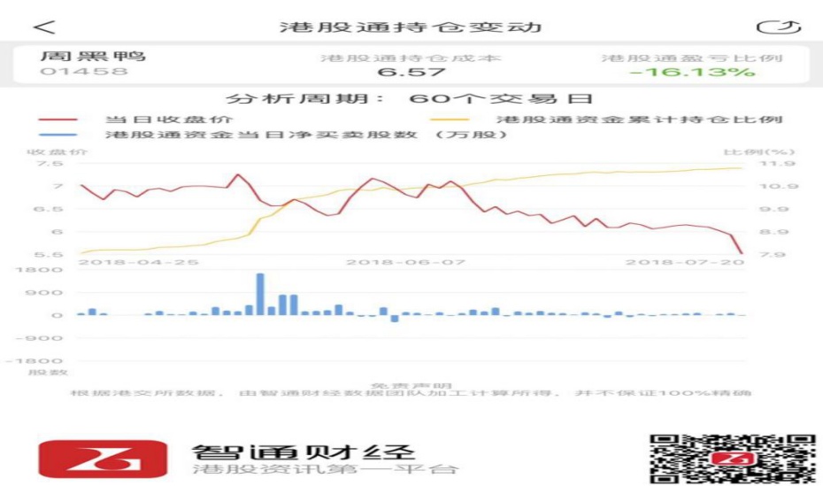 但所谓“人弃我取”,有人离场必然有人进场。智通财经APP港股通持仓变动数据显示,内地资金近几个月正在持续增持周黑鸭股票,持仓比例已经从4月底的5.5%左右增至近11%。截至7月20日,内资持仓周黑鸭的亏损比例已经超过16%。