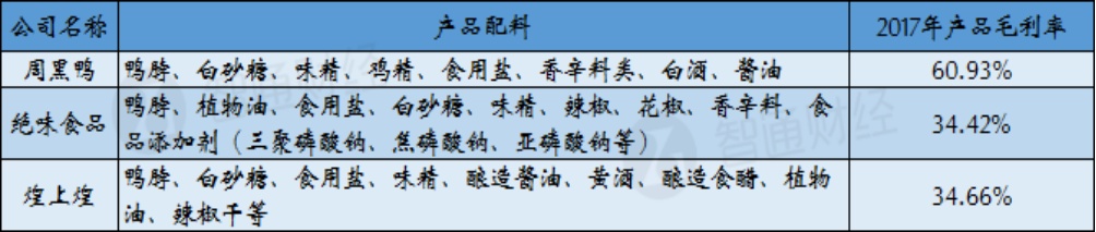 根据智通财经APP的了解,从鸭脖产品的配料来看,周黑鸭主打甜辣口味与绝味同类产品的麻辣口味和煌上煌的酸辣口味形成鲜明差异。产品的差异化再加上自营模式,令周黑鸭产品总体毛利率常年保持在60%以上,公司产品竞争力有多强不言而喻。
