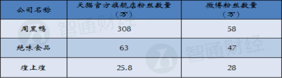 周黑鸭天猫官方期间店数据显示,公司的粉丝数量已经达到308万,远远超过绝味食品的63万和煌上煌的25.8万。此外,周黑鸭官方微博的粉丝数量也达到58万,远高于其他两家。