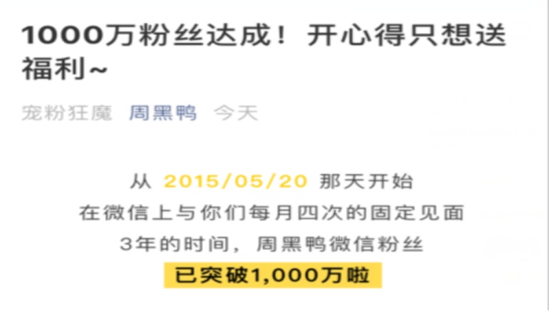 7月24日,周黑鸭在其微信公众号中发布消息称,公司微信粉丝数量已经突破1000万之众。