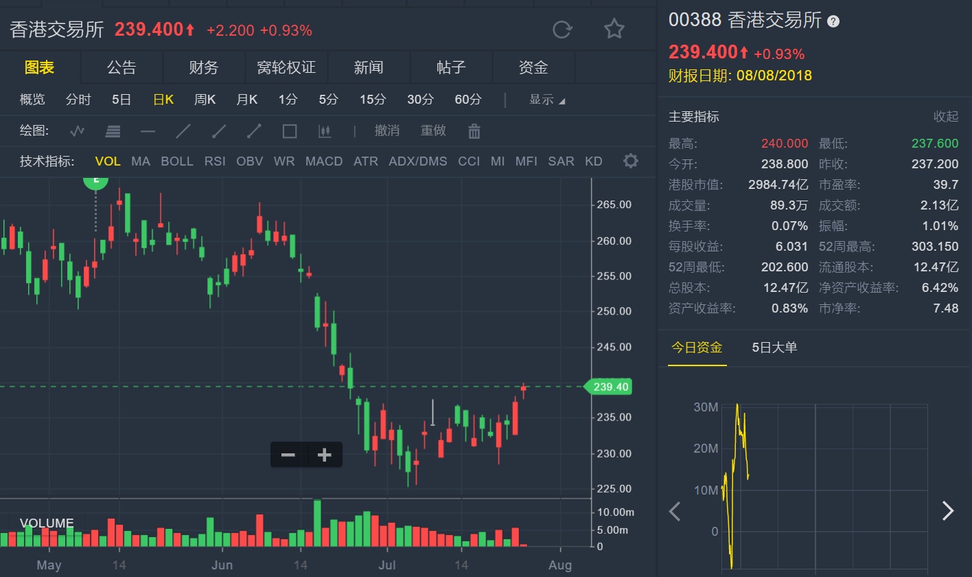 截至7月25日10:15,港交所涨0.93%,报239.4港元。