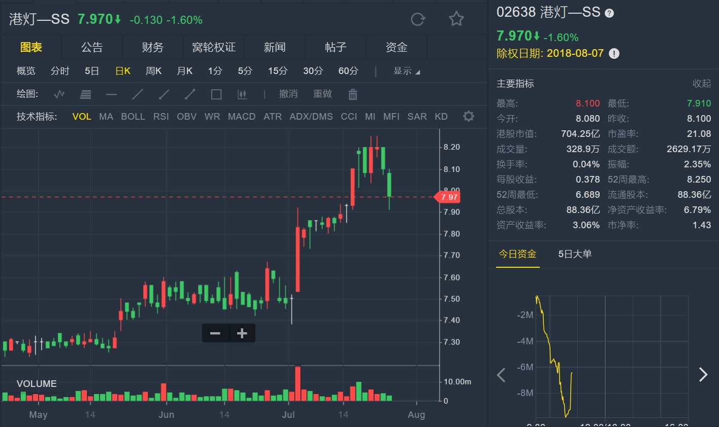 截至7月25日10:50,港灯跌1.6%,报7.97港元。
