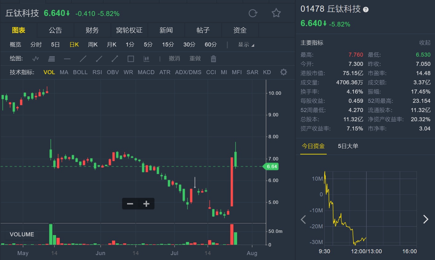 截至7月25日,丘钛科技跌5.82%,报6.64港元。