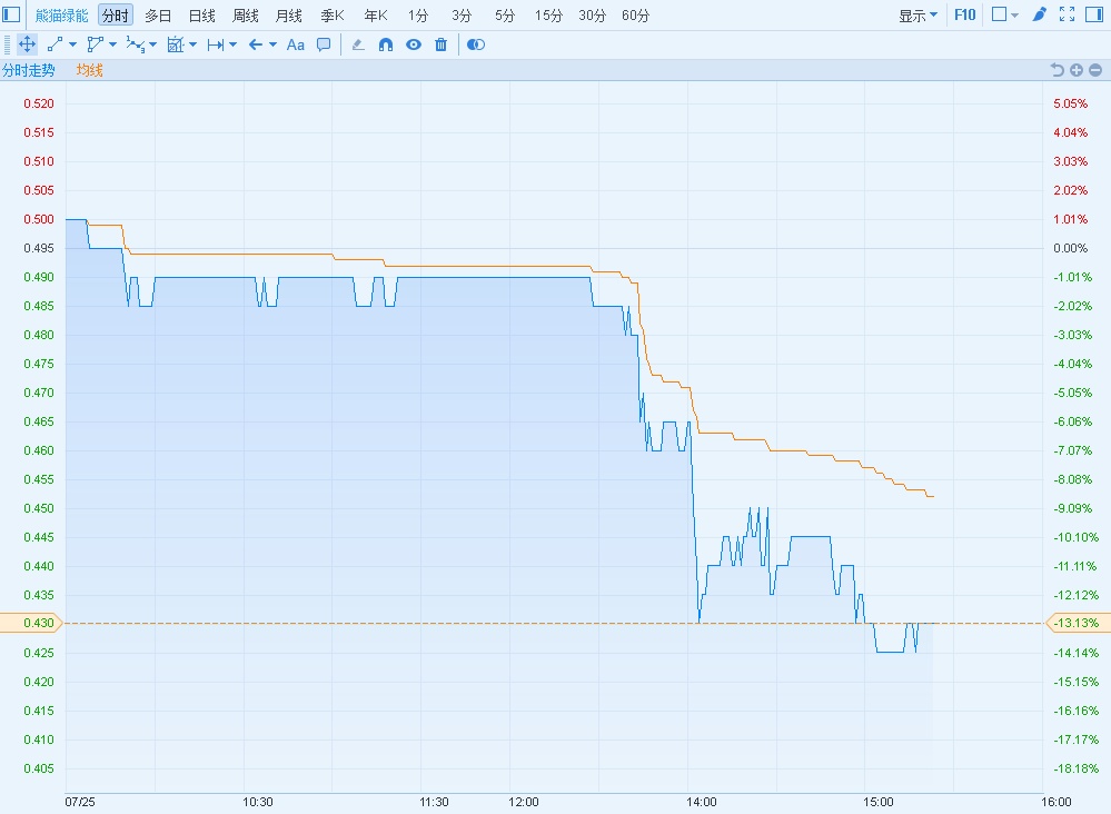 智通财经APP获悉,熊猫绿能(00686)今日高开低走,午后放量大跌,截至发稿跌13.13%报0.43港元,成交5410万股,涉资2448.5万港元。